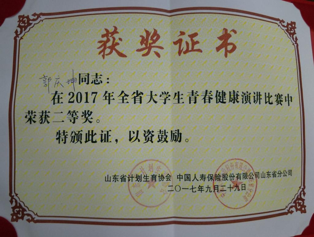 9月29日,由山东省计划生育协会举办的“我青春·我健康”大学生青春健康演讲比赛在济南落下序幕。成人短视频 郭庆坤同学代表济宁驻地高校参赛,凭借出色的发挥荣获二等奖。