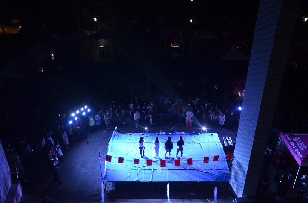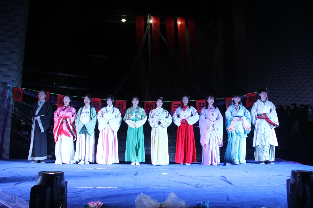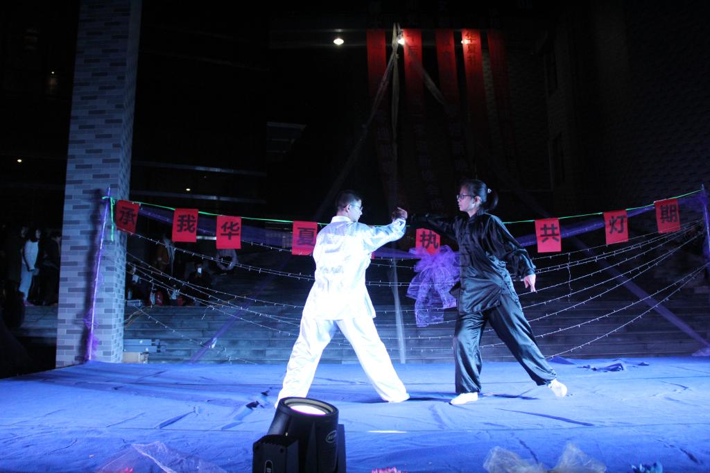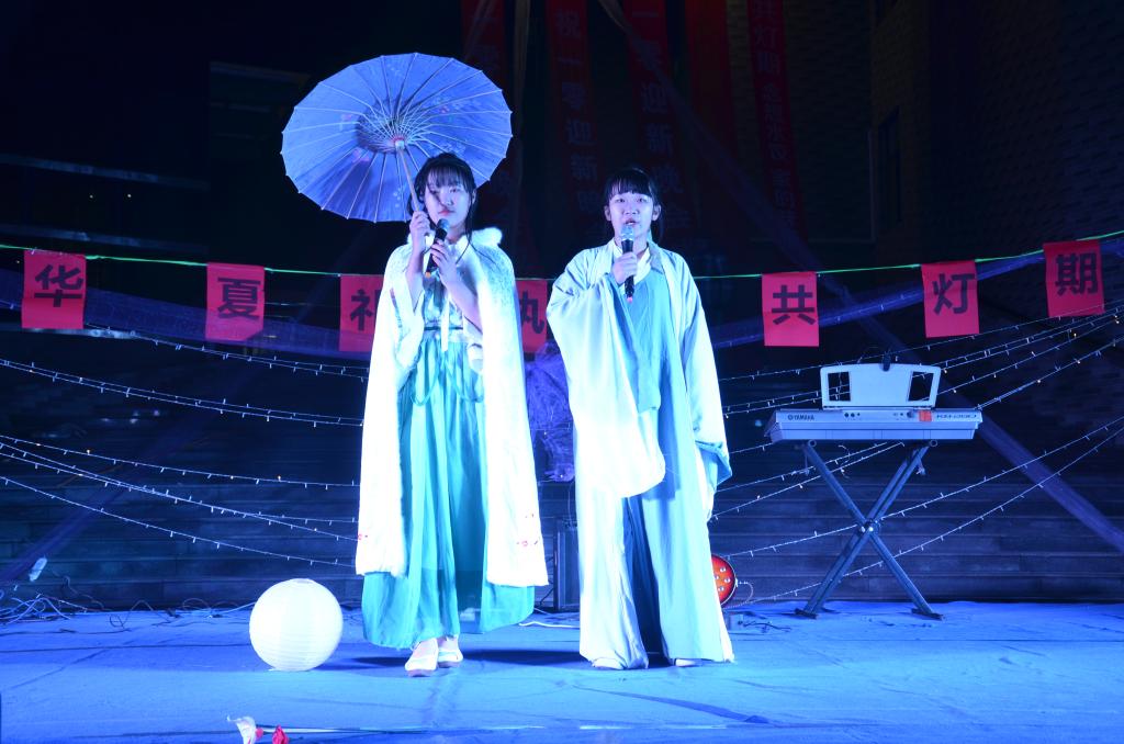 夜幕降临,灯光点点。乐队的激情演出拉开了晚会的序幕,古琴幽幽,发思古之情,伞舞翩翩,诉说神秘《美人吟》。少数民族舞蹈的精巧服饰、优美身影给人以美的享受,娟丽端庄的汉服走秀,展现了我国汉家文化独有的柔美,《傲雪寒梅》体现了中华武术的行云流水、傲然洒脱,一张一弛、一招一式无不赢得台下观众的阵阵掌声。“猜灯谜、赢奖品”环节,全场观众积极参与,虽深夜风寒却热闹活泼。台上表演精彩,台下花灯集市热闹非凡,手工制作、书法展示,投壶、射礼体验等活动也在同期进行,各个社团拿出自己的特色,引来游人纷纷驻足。晚会结束后,主持人宣布抽奖环节中的获奖名单并送上精美汉服,同时鼓励大家参与到花灯等传统手工制作中来。