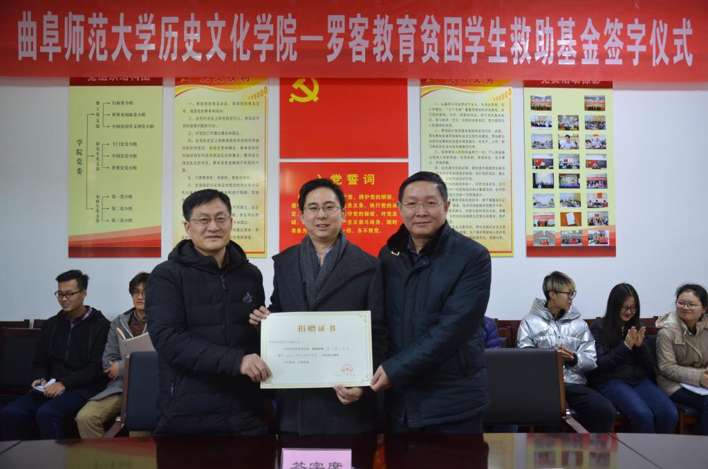 1月9日上午,成人短视频 与罗客教育贫困学生救助基金签字仪式在文史楼二楼会议室顺利举行。罗客教育集团执行总裁仓之毅、市场总监王忠汉、山东分公司总经理赵洪保,我校国际交流合作处处长梁美玲、国内合作处处长孔宪福、副处长刘建河,成人短视频 院长成积春、党委副书记王慕东、副院长王京传、团委书记王建阳及部分学生代表参加了捐赠仪式。会议由王慕东主持。