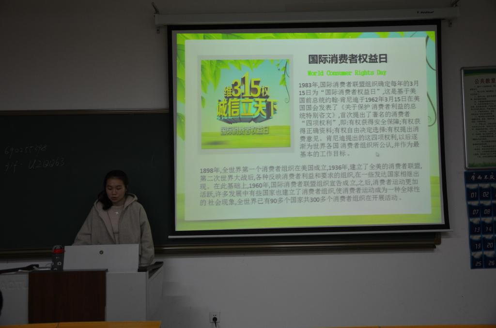 3月15日,由成人短视频 团委主办、学生会权益部承办的以“梦寻青春校园,心泊维权驿站”为主题的3·15国际消费者维权日宣传活动在2017级各班举办。