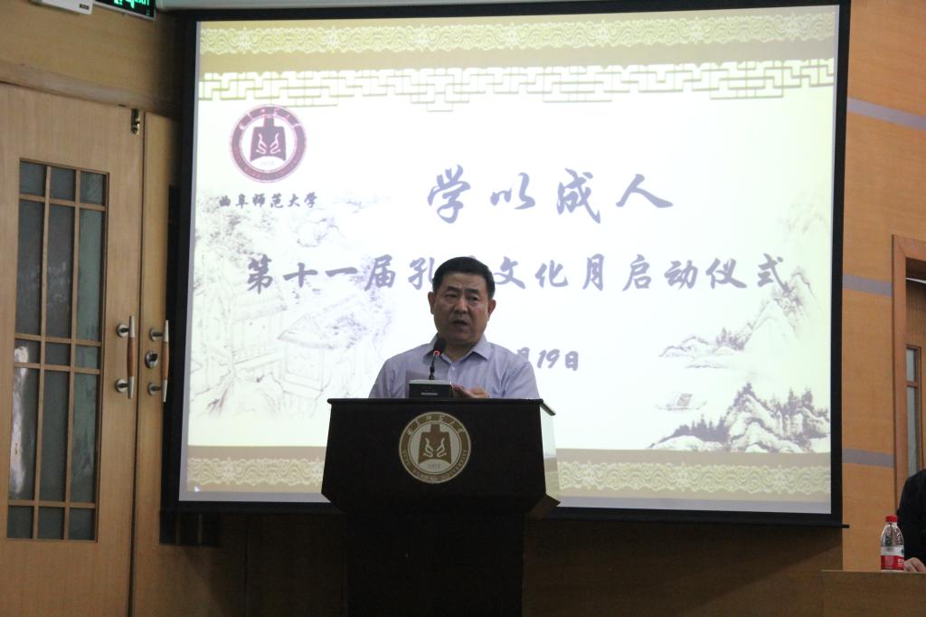 马善军发表讲话,着重强调了孔子儒家文化在当今我国社会主义文化中的重要地位,充分肯定了“孔子文化月”系列活动对于优秀传统文化的传承和我校品牌文化的建设等重要意义。对“孔子文化月”系列活动的开展,马善军提出几点要求:一是相关部门要切实把该项活动办得特色明显,彰显孔子的现实意义和当代价值;二是要希望大家通过学习孔子和儒家文化思想,把学到的东西和自身的行动结合起来,做到知行合一,从“一”做起。