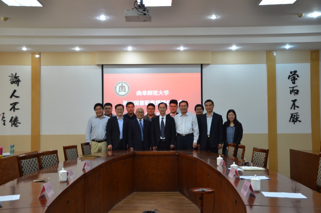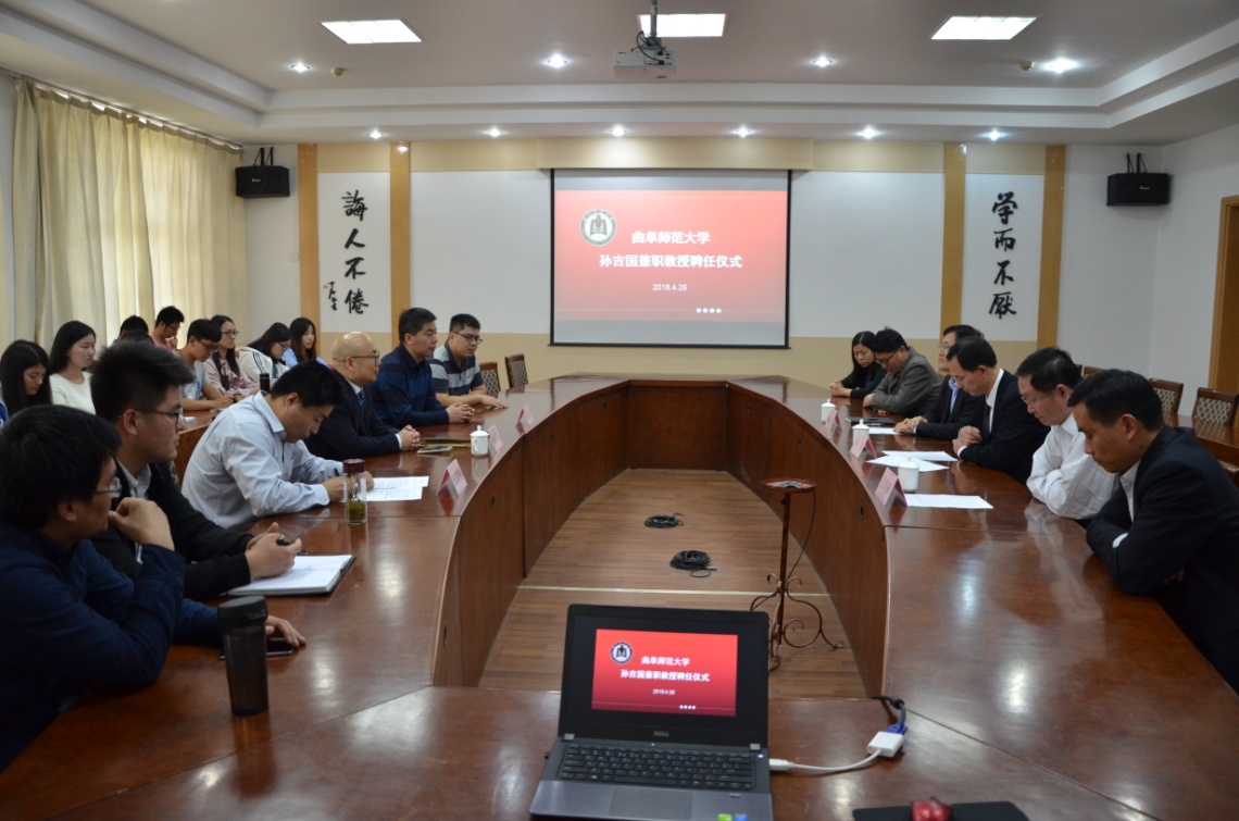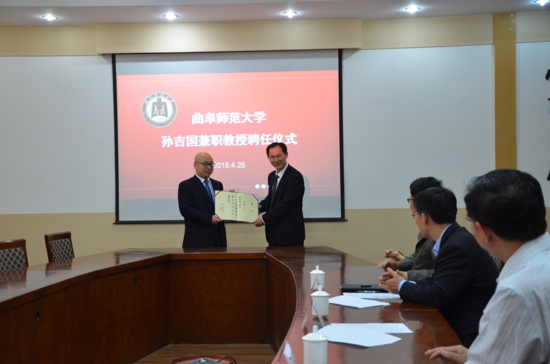 4月26日下午,成人短视频 在科技楼二楼北会议室举行聘任仪式,聘任山东省区域文化产业研究院院长、山东省高端智库人才入库专家孙吉国研究员为兼职教授。我校副校长辛杰、国内合作处处长孔宪福、人事处副处长孟祥水、成人短视频 院长成积春等出席仪式,辛杰代表学校向孙吉国颁发兼职教授聘书。