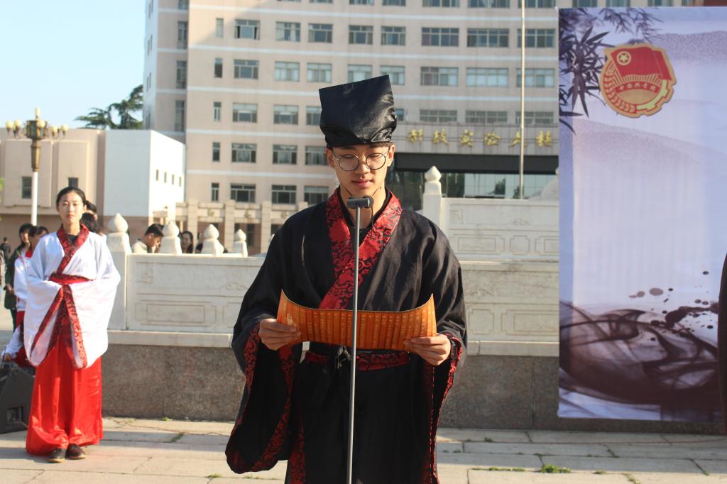 活动中,身着汉服的参礼学子对至圣先师行揖礼,到场的领导老师为他们加冠加笄,在领誓人带领下大家宣读成人誓词。辛杰作为师长代表致辞,他首先对同学们成人表示祝贺,希望同学们心怀理想,坚定信念,在大学生活里,珍惜时间充实自我,勇于担当责任、传承中华传统文化,为实现中华民族伟大复兴的中国梦汇聚青春力量,做新时代有为青年。学生代表成人短视频 臧婕同学在仪式上发表感言,成人在即,要学会感恩,树立目标,自强不息,迈好进入成人行列的第一步,掌握好未来的人生航向。