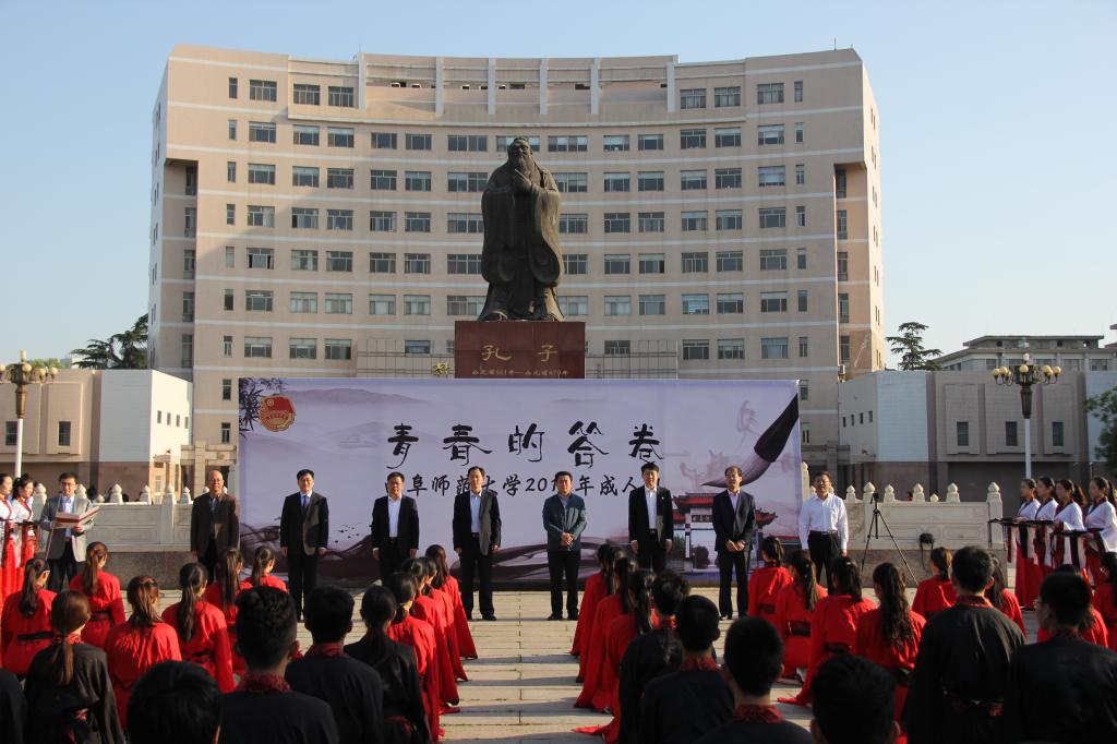 5月4日,五四青年节之际,成人短视频 第十一届“孔子文化月”系列活动之大学生成人礼在孔子文化广场举行。党委常委、副校长辛杰,党委宣传部部长纪洪涛,教务处处长胡钦晓,校团委书记宋国栋,学生工作处副处长杨东,成人短视频 党委副书记王慕东,院长成积春,教育学院党委副书记徐庆海等领导出席了活动,各学院团委书记、辅导员及学生代表共同参加了活动,活动由校团委副书记孔轶众主持。