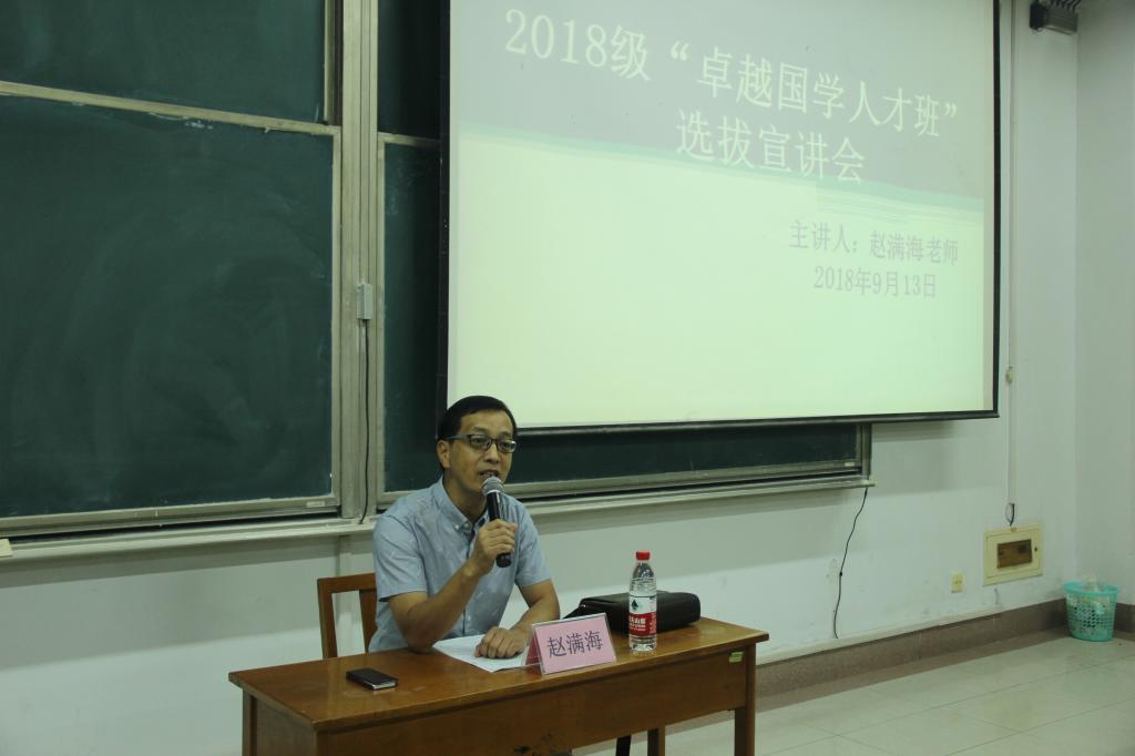 9月13日晚,成人短视频 国学教研室主任赵满海在综合楼205教室面向2018级历史班同学进行了2018级国学卓越班分班宣讲。