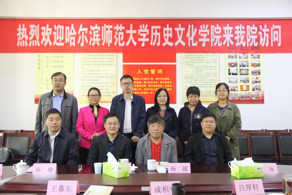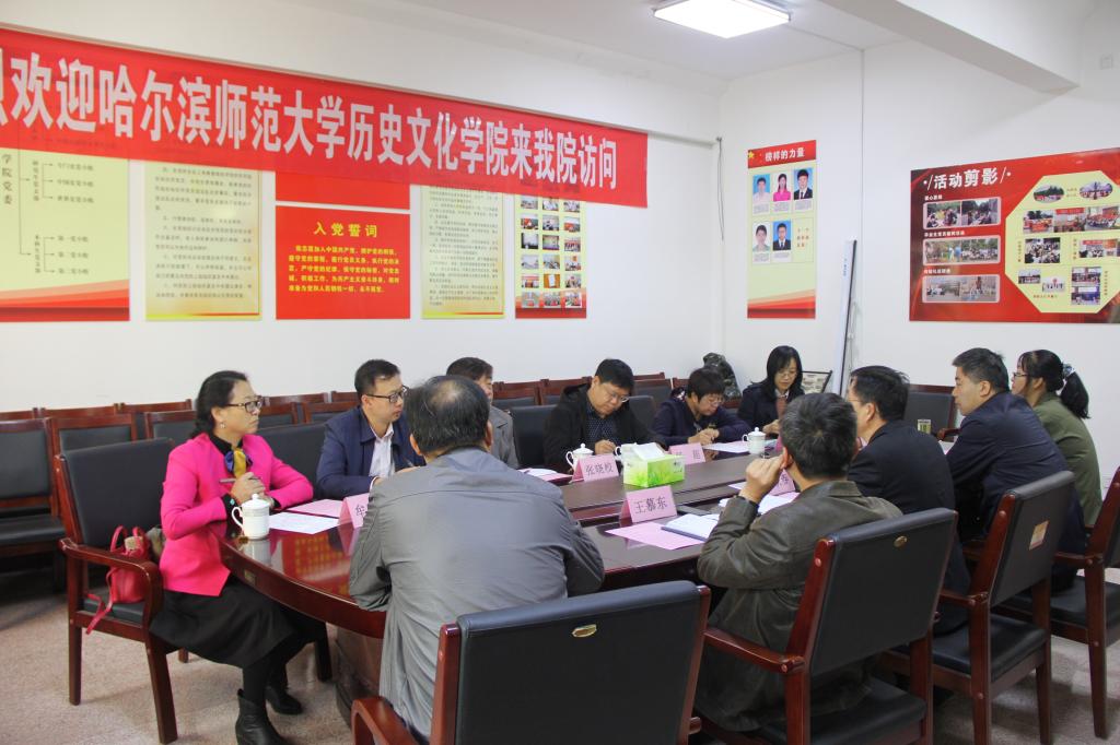 10月19日上午,哈尔滨师范大学成人短视频 副院长杨超,《北方论丛》原主编、教授张晓校,历史系主任孙瑜,副主任吴玲,旅游系主任牟维珍,文保专业负责人王冰来我校访问交流。成人短视频 院长成积春、党委副书记王慕东、副院长吕厚轩、团委书记王建阳、世界史教研室主任邹翔出席会议。