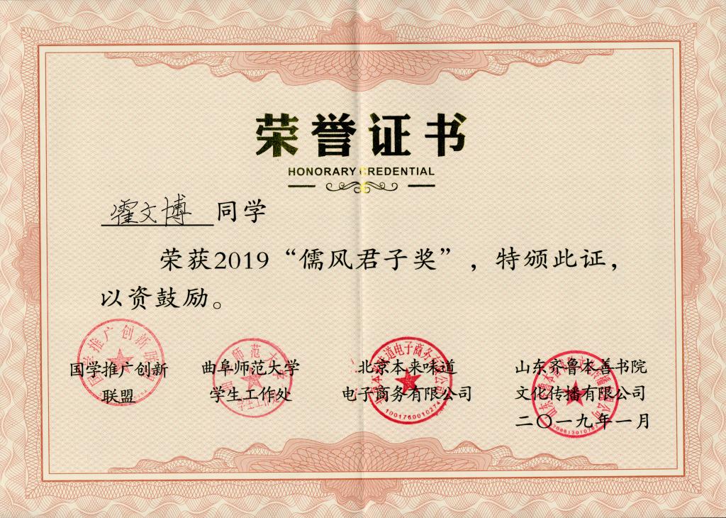 2019年1月15日下午,我校30名优秀学子在曲阜市“本来味道2019跨年盛典”上荣获首届儒风君子奖学金,每人获得奖金2000元。其中成人短视频 2017级中国史博士陈岳和2016级国学班本科生霍文博两位同学荣获奖学金。