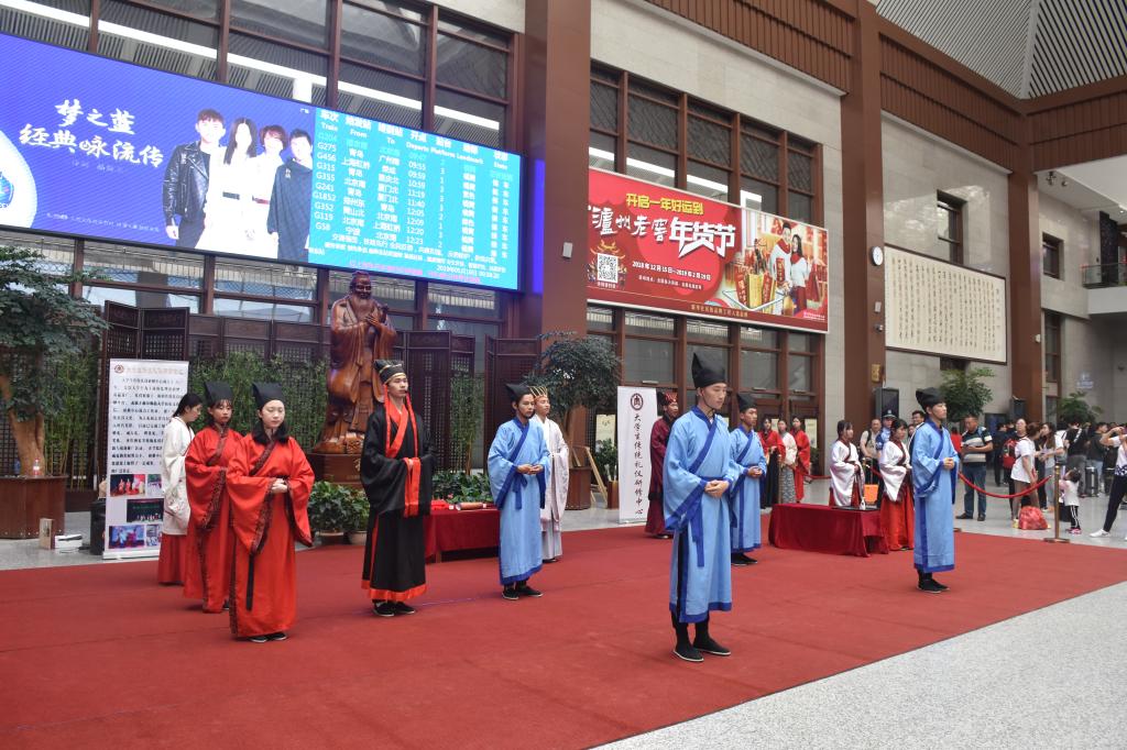 5月16日上午,成人短视频 大学生传统礼仪研修中心为弘扬儒家传统文化在曲阜东站为旅客们进行了传统礼仪展演。