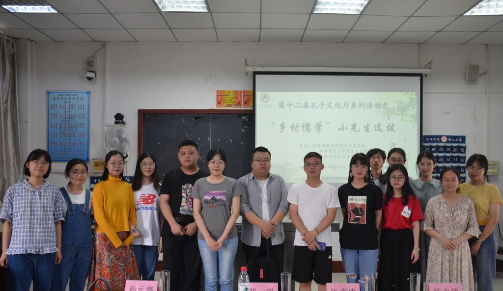 5月19日下午,第十二届孔子文化月系列活动之“乡村儒学小先生”选拔比赛在文史楼520教室圆满落幕。比赛邀请成人短视频 2015级国学班学生代表杨永涛、张兆成、孙元睿、郑双担任评委,由成人短视频 2017级国学班学生代表胡杰文主持。