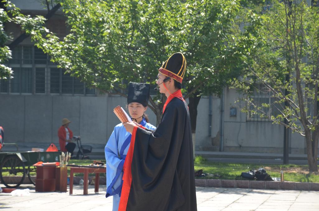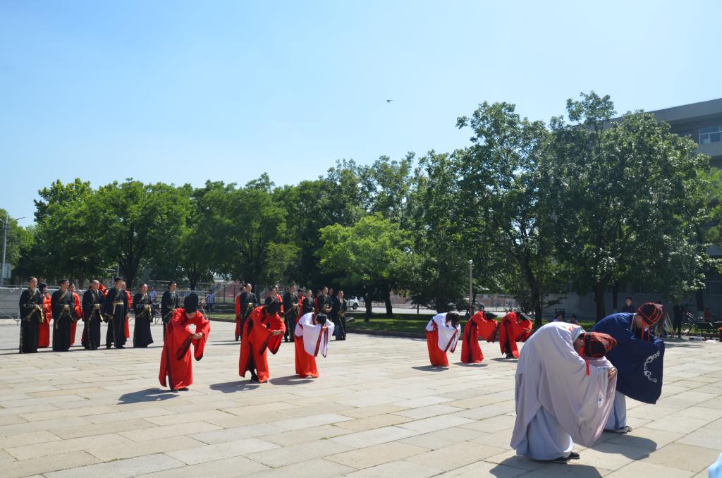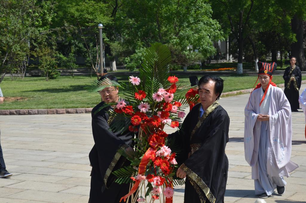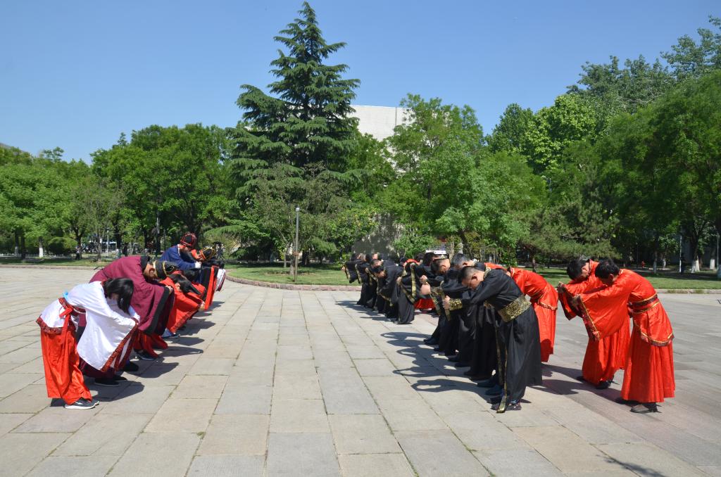 随着咸和之乐缓缓奏起,30余名学生代表和老师们身穿汉服,头顶儒冠在孔子像前展演“拜谒仪”。在悠扬的钟鼓声中学生和老师们向孔子像行初献、亚献、终献之礼,教师代表向孔子像敬奉花篮。