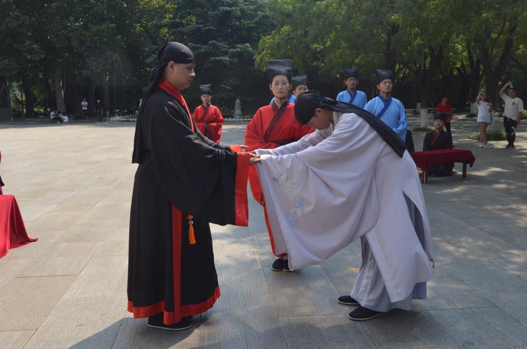 随着弦和之乐缓缓奏起,学生代表身着汉服,头顶儒冠向全场师生展演“束脩礼”。参加仪式的曲园学子在悠扬的钟鼓声中向全体师生依次展演正衣冠、诵读《束脩告文》、献戒等仪式。整场礼仪庄严、古朴,全体师生心怀敬意,在独特的儒家氛围中,以彬彬古礼谢师恩、表敬意,展现出尊师明道的深厚文化底蕴。
