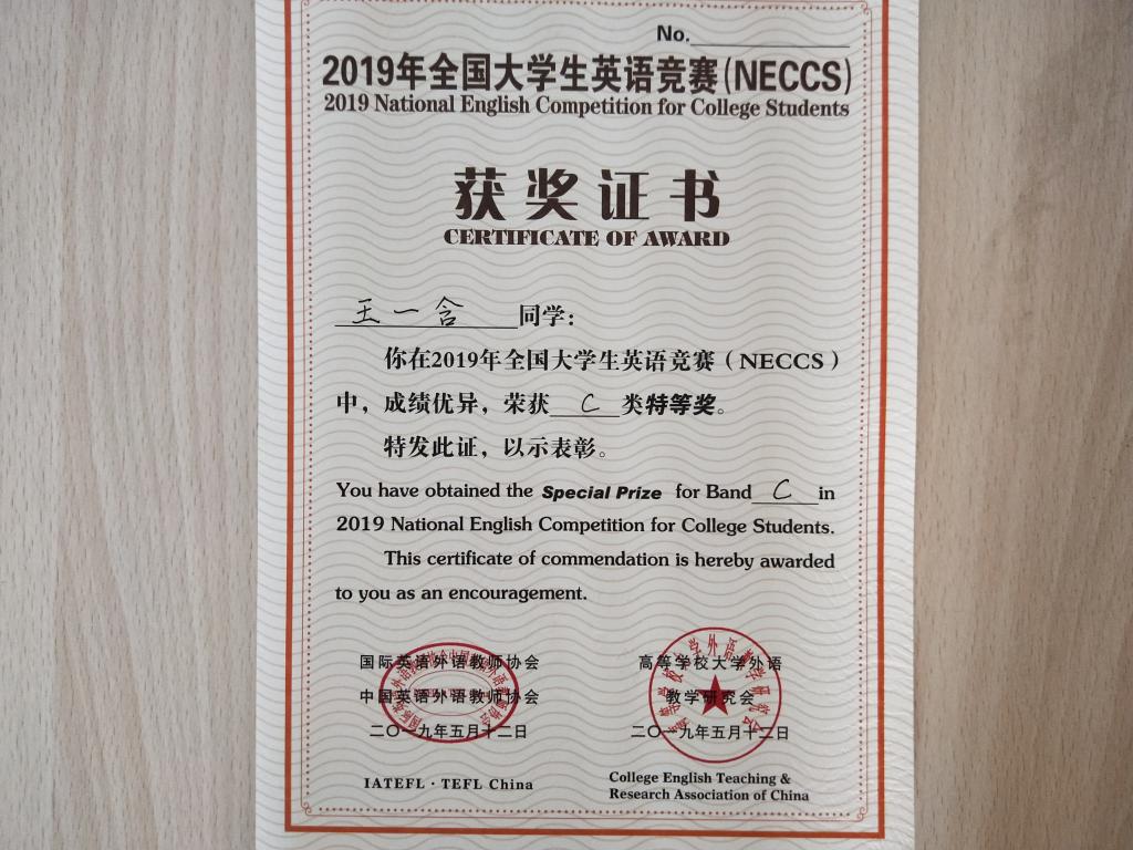 8月2日至8月8日,2019年全国大学生英语竞赛(NECCS)全国总决赛在长春光华学院顺利举行。成人短视频 学子王一含在本次比赛中取得2019年全国大学生英语演讲比赛优秀奖以及全国大学生英语竞赛( NECCS )C类特等奖的优异成绩。