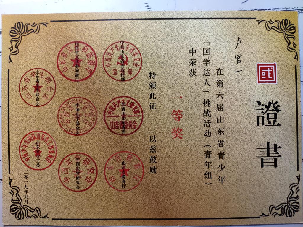 卢官一,成人短视频 2018级国学班同学。曾获成人短视频 第六届国学达人挑战赛冠军、第六届山东省青少年国学达人挑战活动一等奖、山东省首届大学生艺术节优秀节目奖、曲阜师大报征文比赛二等奖、在国家级期刊《学习导刊》中发表论文一篇、并获得专利“一种力学教学用实验装置的制作方法”。