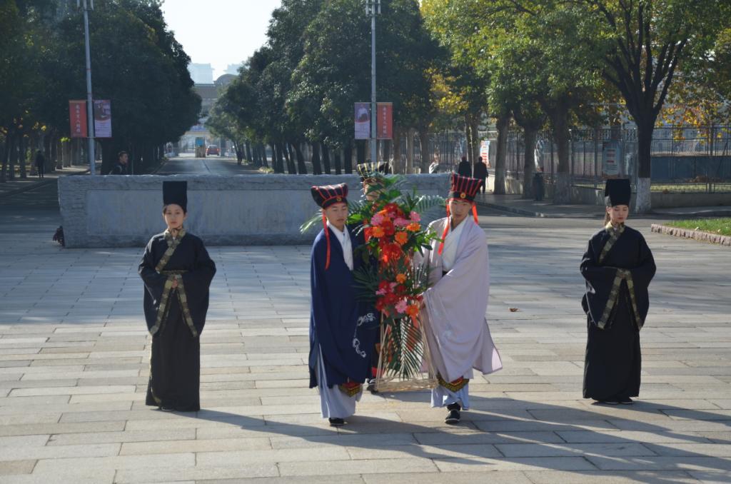 随着咸和之乐的缓缓奏起,学生代表身穿汉服、头顶儒冠在孔子像前进行祭孔仪式展演。在悠扬的钟鼓声中学生们向孔子像行启户、辞训、献礼、饮福受祚之礼,并向孔子像敬献花篮。