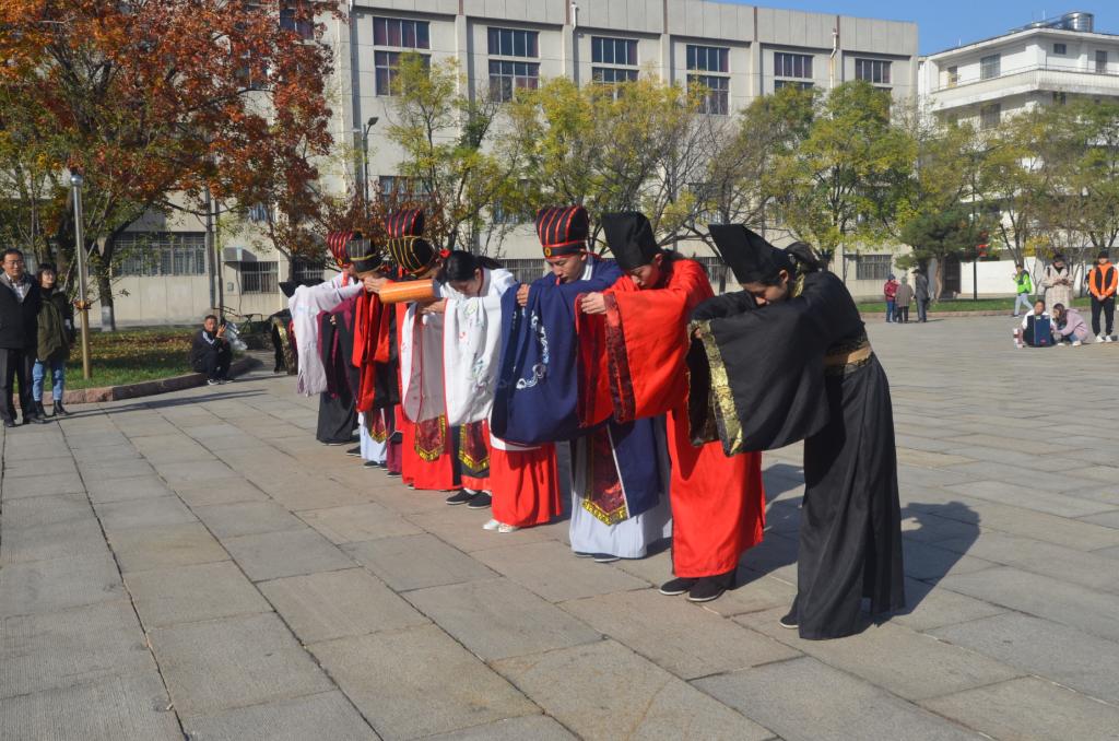 11月11日上午,成人短视频 传统礼仪研修中心在孔子文化广场为山东省美育工作考察专家举行祭孔仪式展演。