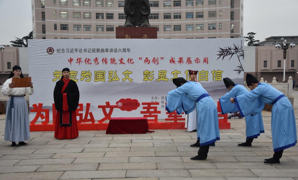 11月26日下午,为纪念习近平总书记视察曲阜6周年重要讲话,推动落实”文化立校”战略,推进中华优秀传统文化继承与发扬,由校党委宣传部、校团委、校工会、离退休工作处、体育科学学院、书法学院和成人短视频 联合举办的中华优秀传统文化“两创”成果展示周活动开幕式在孔子文化广场隆重举行。学院党委副书记王建阳出席仪式。