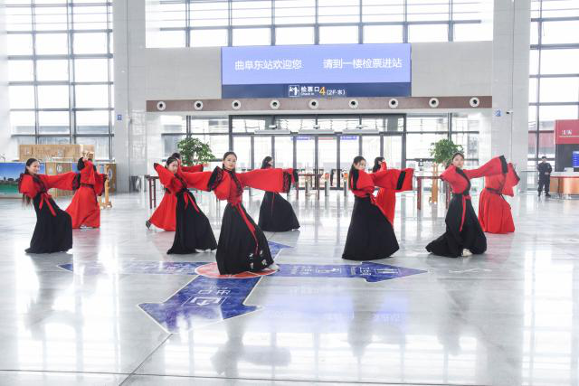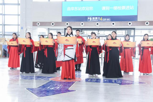 11月26日上午,鲁南(日兰)高速铁路日照至曲阜段正式通车,我院师生受邀在曲阜东站新建成的候车大厅进行传统文化活动展演。曲阜高铁站也是成人短视频 大学生社会实践基地之一,我院党委副书记王建阳、2018级辅导员韩琳琳老师和洙泗学社的同学们出席了该活动。