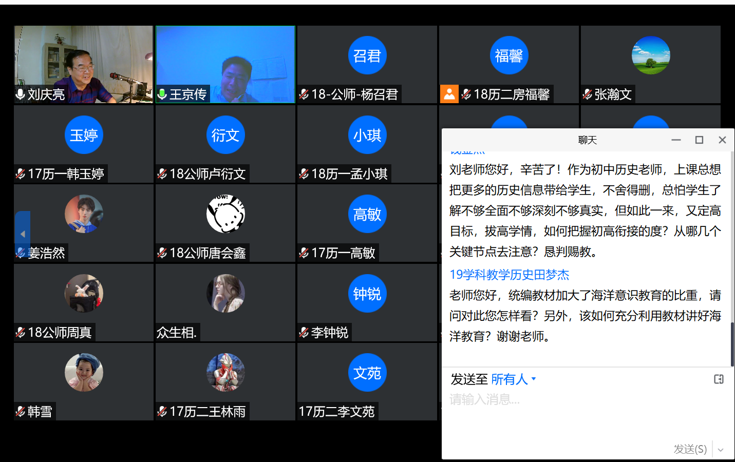 6月12日晚,2020年第1期洙泗讲堂暨“中学历史教学名师进曲园”讲座通过腾讯会议在线上举行。刘庆亮教授为成人短视频 师生做了题为“怎样做一个优秀的中学历史教师”的报告。报告由成人短视频 王京传教授主持。