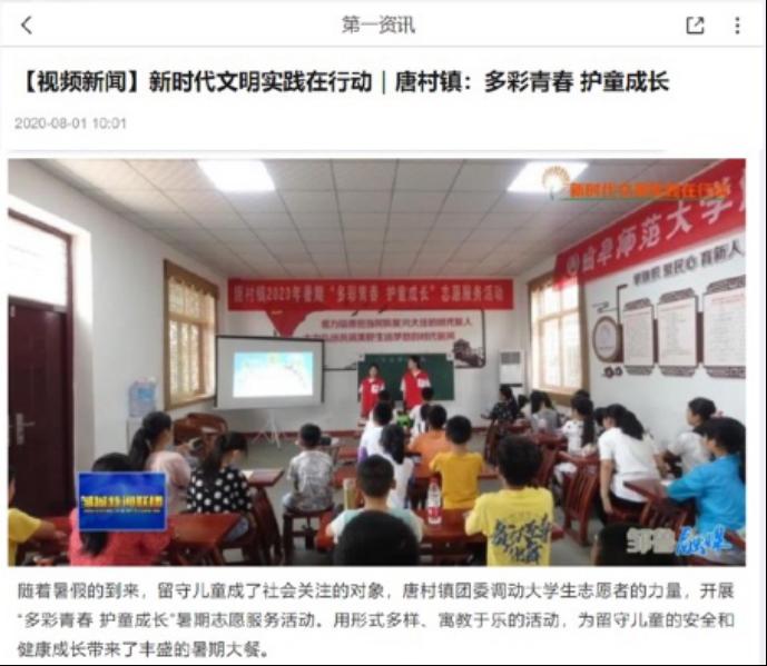 随着暑假的到来,留守儿童成为了社会关注的对象,成人短视频 “国学小课堂”教育志愿服务团在山东省邹城市唐村镇支教期间开展了“多彩青春,护童成长”暑期志愿服务活动,引起媒体的广泛关注。其中,邹城广电媒体对成人短视频 “国学小课堂”社会实践活动进行了详细的采访报道。团队负责人刘学栋在采访中表示,团队初衷就是要给当地学生带来独特的课程知识,为当地学生打开全新的世界,活动也帮助实践团队对脱贫攻坚乡村振兴有了更深的了解,在实践中受到了教育,是一笔宝贵的人生财富。