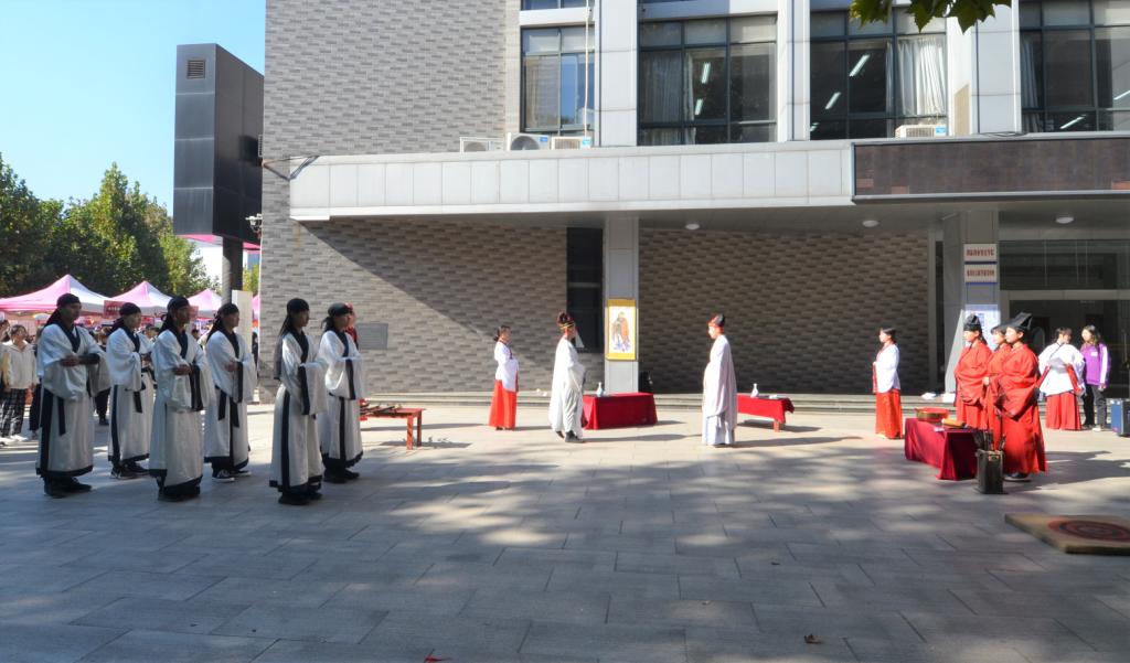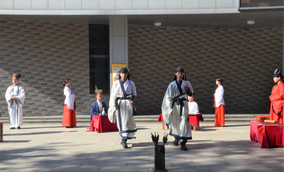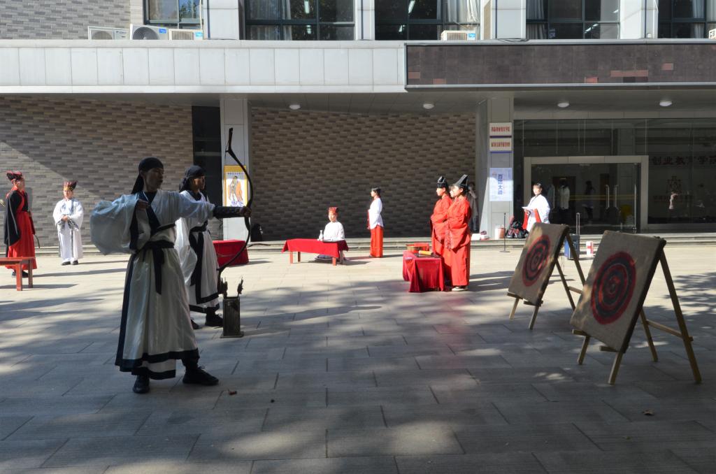 为庆祝我校建校65周年、向校庆献礼,10月24日上午,成人短视频 传统礼仪研修中心在大学生活动中心广场举办束脩礼和射礼的展演。