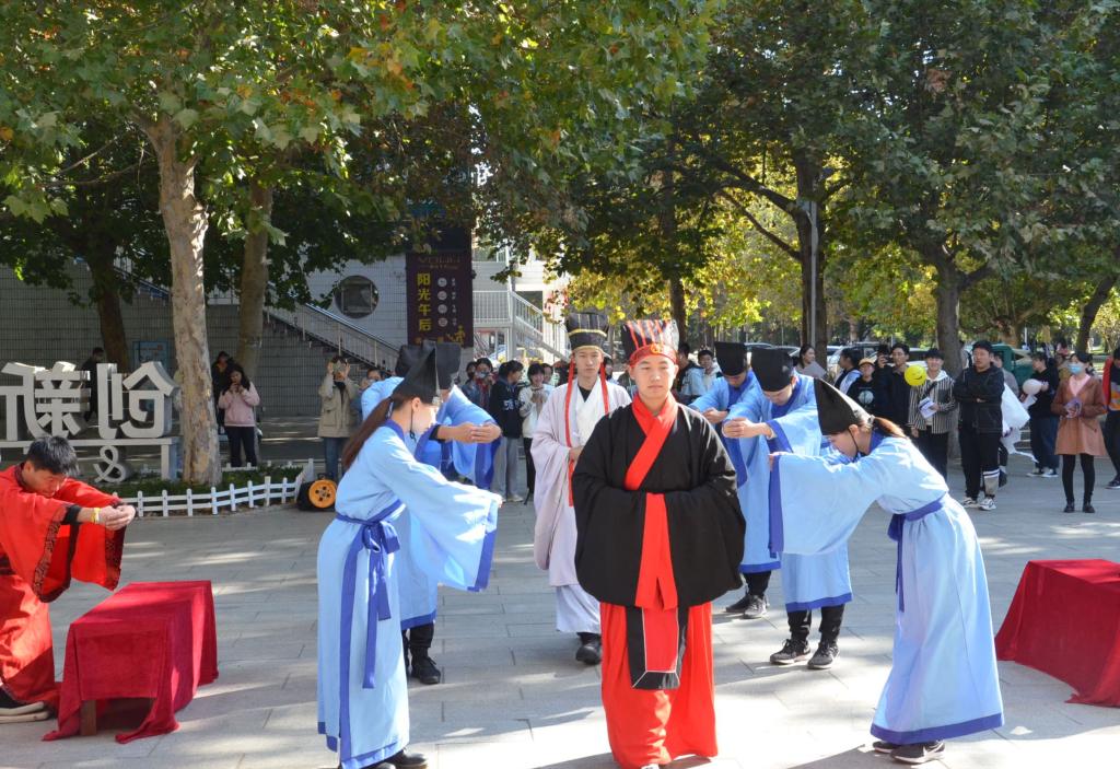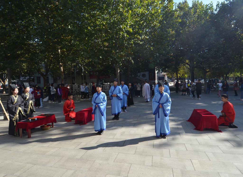 随着咸和之乐缓缓奏起,传统礼仪队队员身着汉服、头戴儒冠,进行束脩礼展演。队员们心怀敬意,在独特的儒家氛围中,以彬彬古礼谢师恩、表敬意,展现出对知识的渴求和学生们尊师重道的情怀。