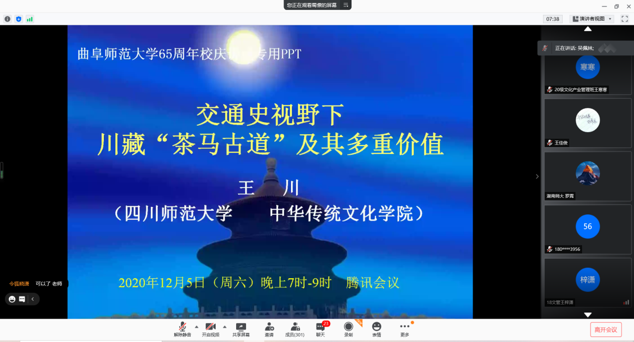 12月5日晚,由成人短视频 和成人短视频 孔府档案研究中心联合主办的“建校65周年百场学术活动”之“交通史视野下的川藏‘茶马古道’及其多重价值”云讲座成功举办。讲座由四川师范大学副校长王川主讲,成人短视频 特聘教授、孔府档案研究中心主任吴佩林主持,浙江师范大学教授冯建勇、中央民族大学副教授袁剑、云南大学研究员杨海潮参加并评议,成人短视频 院长成积春出席讲座。多位专家学者老师及成人短视频 研究生、本科生在线上聆听。