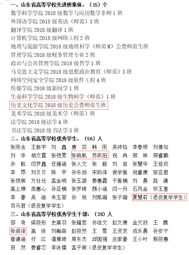 近日,2020年度山东省高等学校优秀学生、优秀学生干部和先进班集体评选活动落下帷幕。经学生自主申报、学院审核、学生工作处、校团委评审等层层筛选,成人短视频 张晓帆、苏辰阳、夏慧莉(退役复学学生)同学被评为“山东省高等学校优秀学生”,张润泽同学被评为“山东省高等学校优秀学生干部”,2018级历史公费师范生班被评为“山东省高等学校先进班集体”。
