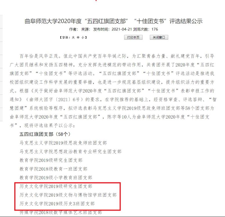 近期,我校2020年度五四表彰工作圆满落幕。经学院推荐,资格审查,评选答辩,“智慧团建”系统核检等程序综合评选,成人短视频 2019级研究生团支部、2019级文物与博物馆学班团支部、2019级历史3班团支部荣获“五四红旗团支部”荣誉称号。