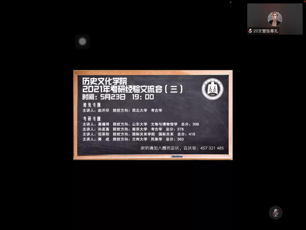 为加强成人短视频 学风建设,帮助成人短视频 学子了解当下推免、考研形势,掌握相关考验技巧,提高成人短视频 学子考研信心,5月23日晚,成人短视频 于腾讯会议线上举办第三期考研经验交流会。会议邀请2017级赵开印、高瑾琪、孙梦菡、岳泽阳、郭成五名同学参加并担任主讲人。