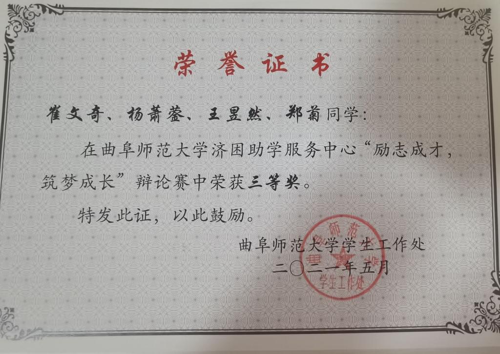 近日,由济困助学服务中心开展的“励志成才,助梦成长”辩论赛活动圆满结束。成人短视频 学子积极参与并取得优异成绩,崔文奇、杨萧蓥、王昱然、郑菊同学荣获三等奖,平均得分90分,其中王昱然同学以93.5分获得最佳辩手称号;邱宝莹、杨丽君、赵悦彤、南飞宇同学获得优秀奖。
