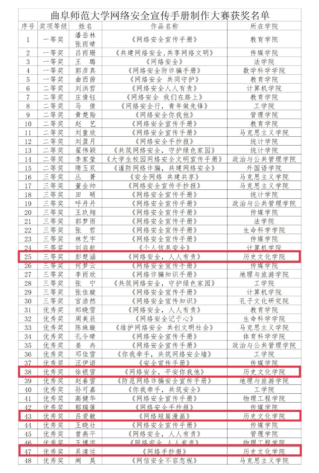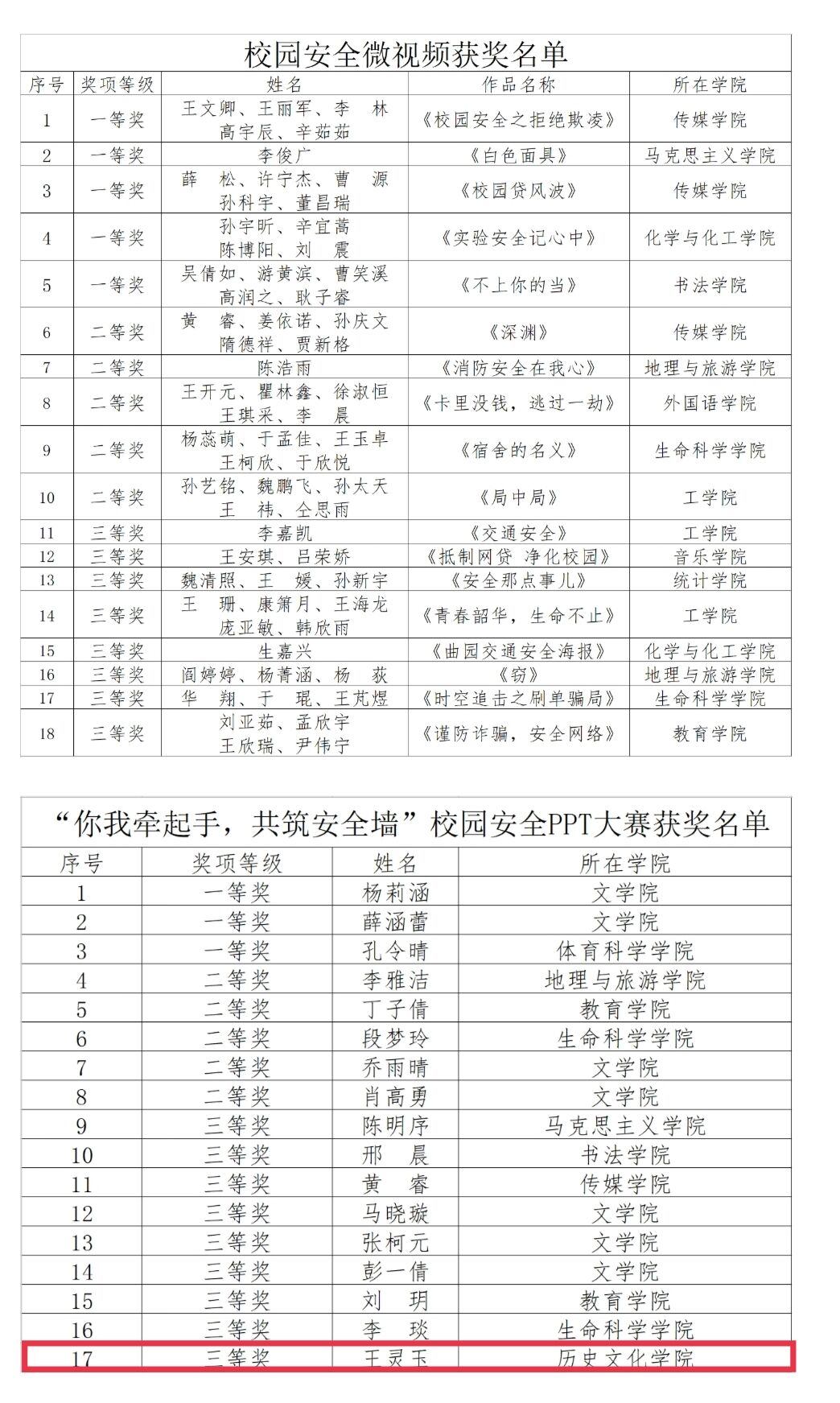 其中,在宿舍公约征集活动中,成人短视频 西公寓一号楼西603宿舍荣获二等奖,西公寓一号楼西611宿舍、西公寓六号楼527宿舍荣获三等奖;在网络安全宣传手册制作大赛中,成人短视频 彭楚涵同学荣获三等奖,徐银雪、吕爱敏、吴清运同学荣获优秀奖;在“你我牵起手,共筑安全墙”校园安全PPT大赛中,成人短视频 王灵玉同学荣获三等奖。