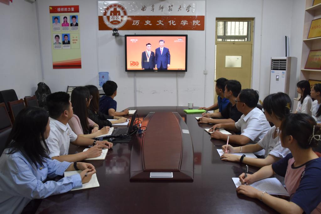 在热烈庆祝中国共产党成立100周年之际,6月29日上午,成人短视频 于文史楼204会议室、各班教室组织师生以直播和回放的形式观看“七一勋章”颁授仪式。
