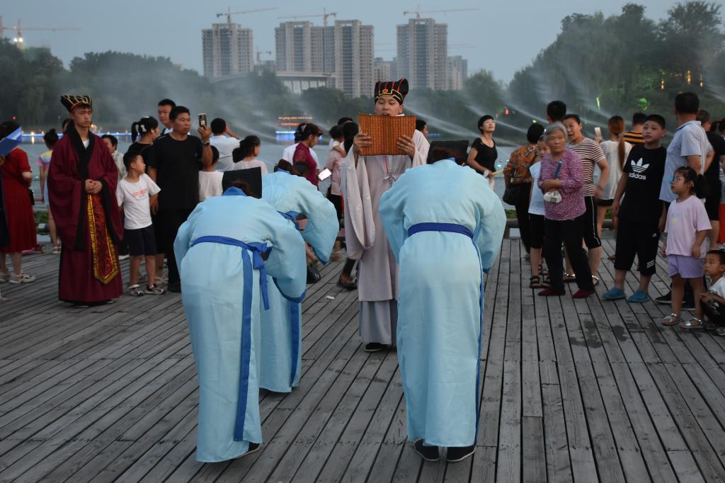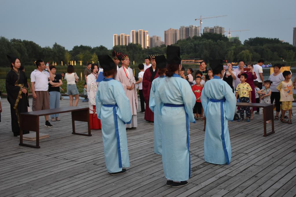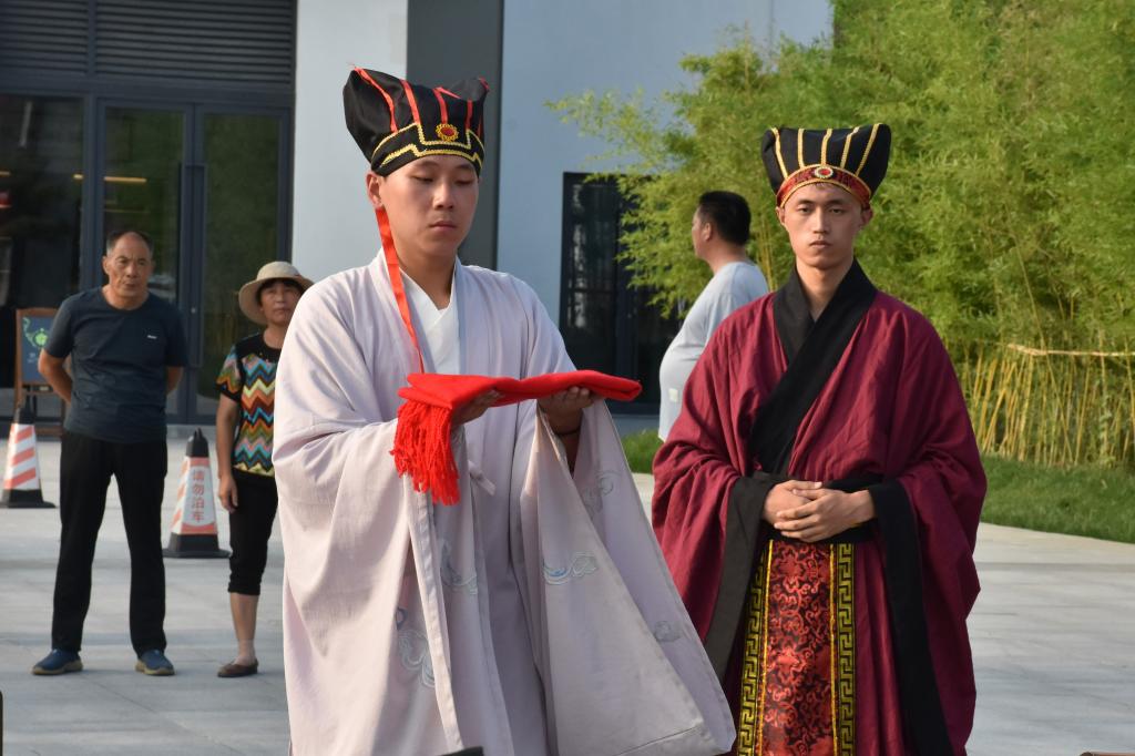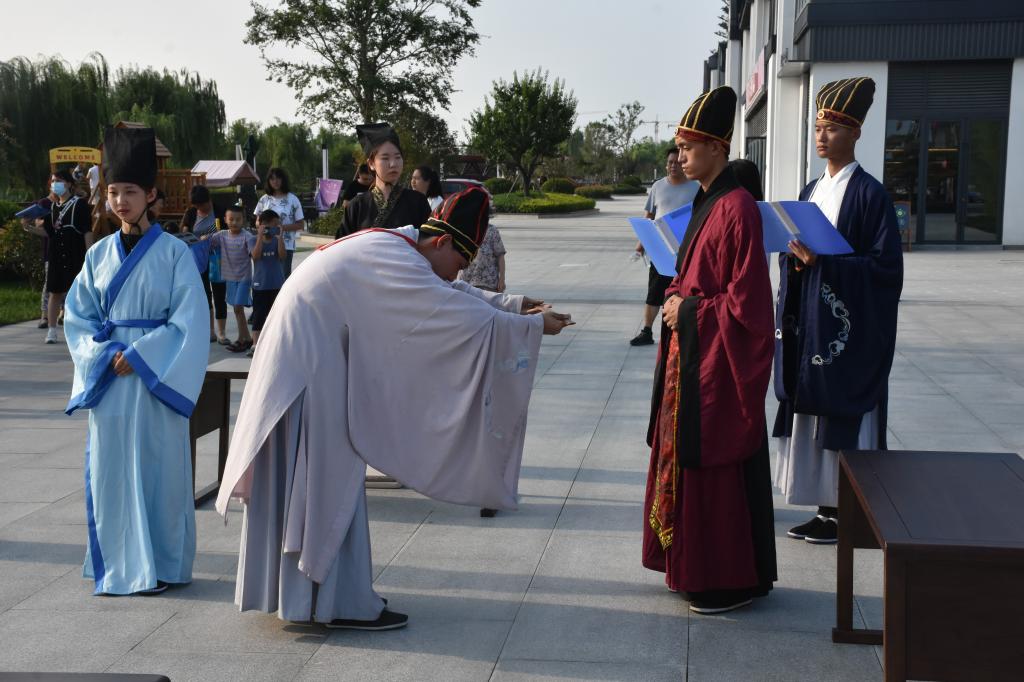 7月18日,成人短视频 “儒家齐鲁文化行”社会实践团队走进第二站宁阳。队员们在宁阳绿景·桃李春风、复圣公园进行束脩礼(拜师礼)展演,用整齐划一的表现给观礼群众带来了一场场精彩绝伦的礼仪表演。