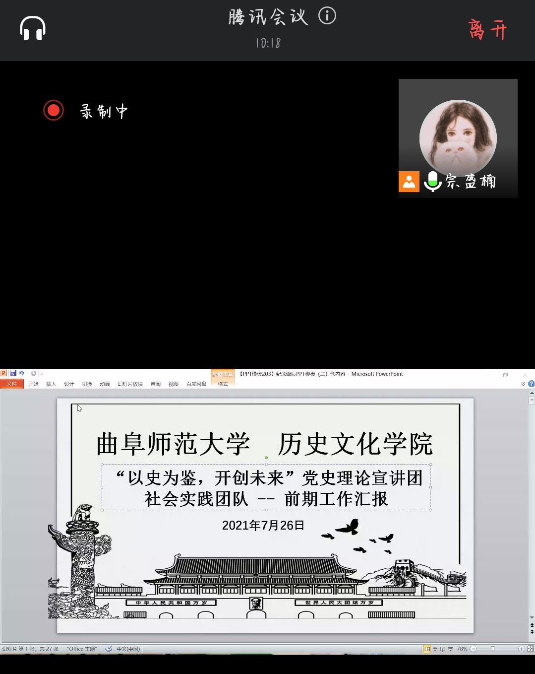 为更好地开展党史宣讲工作,宣讲团队在队长宗盛楠同学主持下,开展线上前期工作汇报会议。会议伊始,宗盛楠同学介绍了家史、党史的具体内容,并对实践方式和实践地点作了明确阐释。在保障防疫要求的前提下,做好自我防护工作,严格落实个人防护措施,全程佩戴口罩,每日定时进行体温检测工作,如出现身体不适等情况,及时去医院就医。同时,还阐述了党史宣讲对象要广泛,尽可能对更多的群众,如学生、青壮年等新一代民众进行宣讲,有助于传扬红色革命精神,培养新一代青年的家国情怀和爱国主义精神,保持对历史的敬畏与向往。