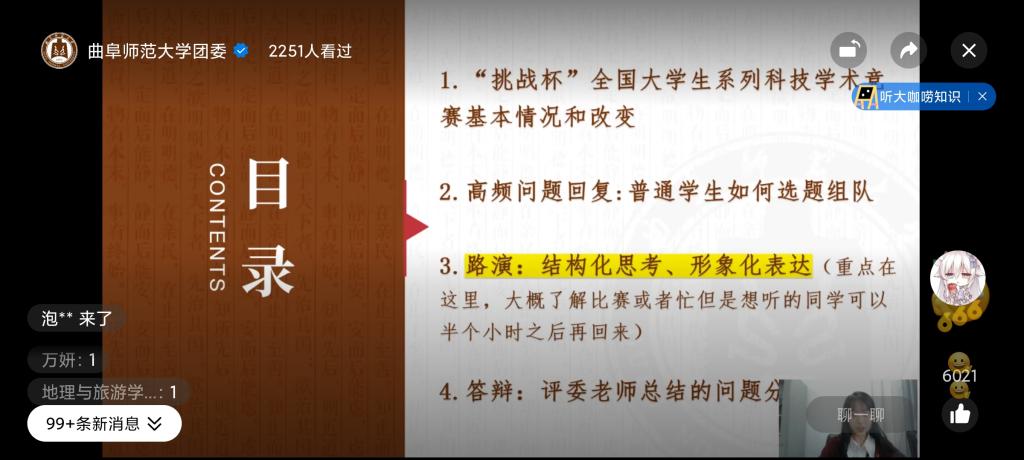 会上,李东格分别从“挑战杯”全国大学生系列科技学术会议竞赛基本情况和改变、普通学生如何选题组队、创业计划的结构化思考和形象化表达以及评委老师总结的问题分类等四个方面向大家作了详细讲解。其中,李东格重点介绍了“结构化思考”要从需求出发,系统性地阐述项目成功的各种“充要条件”,“形象化表达”要尽可能用图形化、数据化的呈现形式使创业计划精准地传达项目价值。同时,李东格强调创业计划要在科技创新和未来产业、乡村振兴和脱贫攻坚、文化创意和区域合作等领域结合实践观察设计项目。最后,同学们针对自己的疑惑向李东格线上留言,李东格耐心解答了同学们的疑惑。