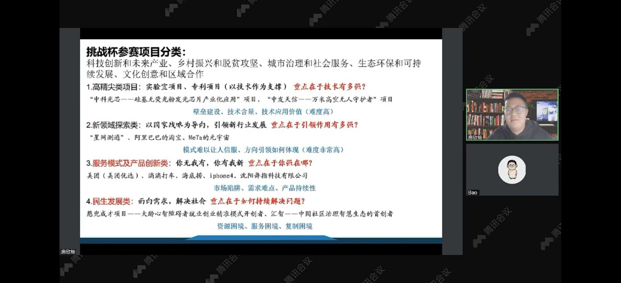 会上,房欣杨以创新创业大赛破解之道——好项目的分解和打造为主题,从挑战杯参赛项目分类、什么是创业、创业项目逻辑、选题建议等方面为同学们进行了详细的讲解。其中,房欣杨强调同学们应该明确创新创业需要商业思维,缺乏商业思维让公益创业难以生存,莫要以上帝思维搞项目。同时,房欣杨讲到,在选题方面同学们应找风口,但不要紧贴风口,要避风口,但是不能脱离主流方向,要先破后立,打破禁锢思想。最后,同学们针对自己的疑惑向房欣杨线上留言,房欣杨耐心解答了同学们的疑惑。