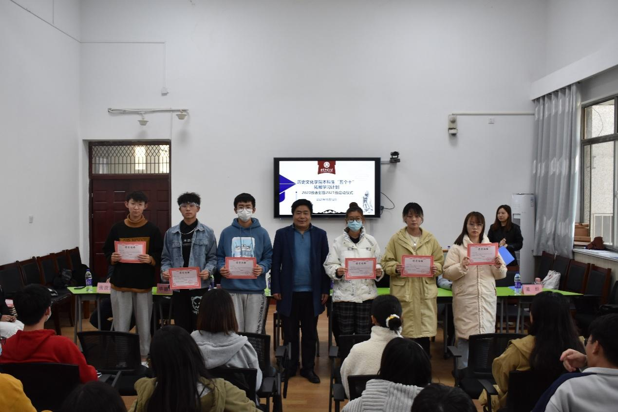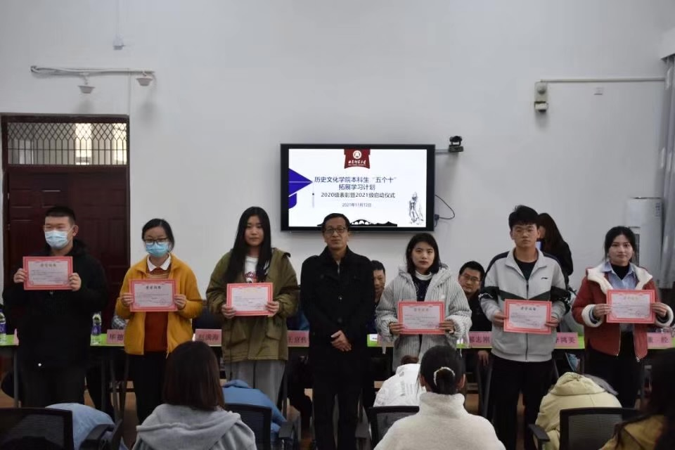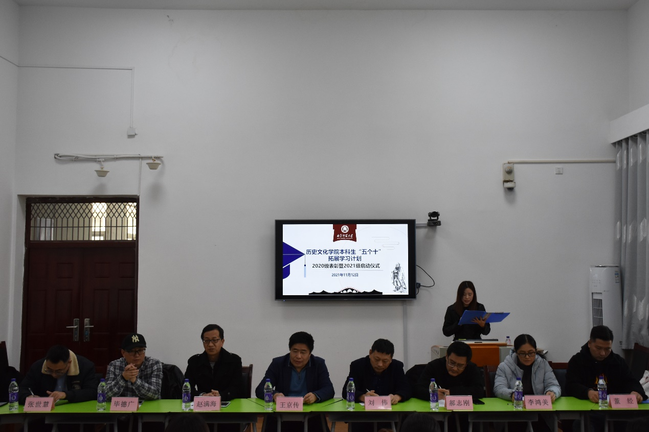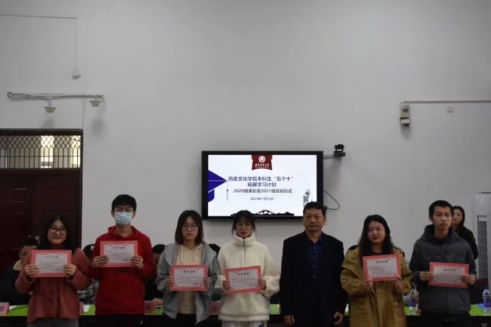 11月12日下午,成人短视频 在文史楼505会议室举行了本科生“五个十”拓展学习计划2020级表彰暨2021级启动仪式。成人短视频 副院长王京传老师、中国古代史教研室主任刘伟老师、国学教研室主任赵满海老师、文化产业管理教研室主任郝志刚老师、文物与博物馆学教研室主任毕德广老师、世界史教研室主任李鸿美老师、中国近现代史教研室主任张世慧老师、2021级辅导员刘贤贤老师、2020级辅导员董经老师出席会议,会议由2021级辅导员刘贤贤老师主持。