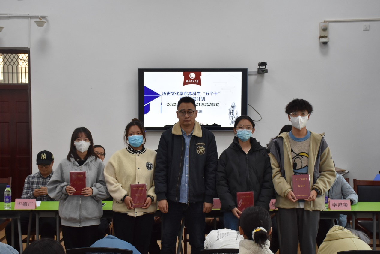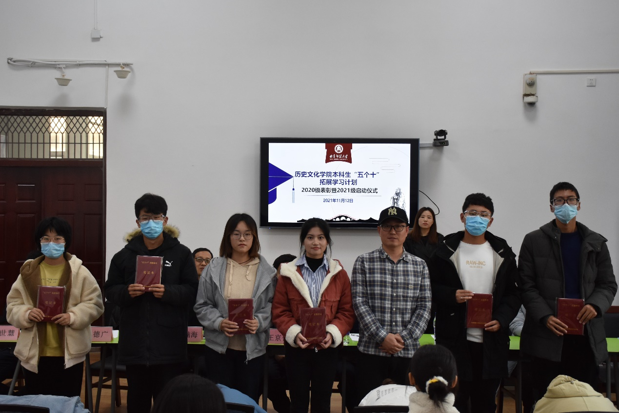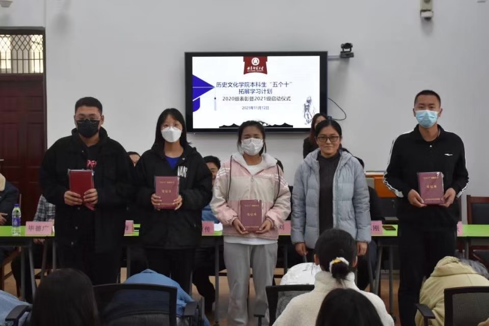 会上,王京传老师首先向同学们总结了“五个十”拓展学习计划的目的和意义,指出“五个十”拓展学习计划可以提升学生的综合素质,拓展学习视野,夯实专业修养,并对同学们能够落实“五个十”拓展学习计划的期望。随后,董经老师公布了24名同学获奖名单,成人短视频 老师为2020级最美笔记大赛获奖同学颁发证书并合影留念。最后,成人短视频 老师为2021级各班学生代表颁发“五个十”拓展学习计划学习记录本,并向2021级新生提出了自己的期望。