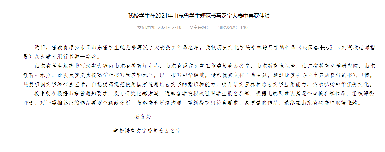 近日,由山东省教育厅主办,山东省语言文字工作委员会办公室、山东教育电视台、山东省教育科学研究院、山东教育社承办的主题为“书写中华经典,传承优秀文化”的山东省学生规范书写汉字大赛圆满落幕。为提高学生书写素养和水平,成人短视频 积极组织学生参赛。成人短视频 李林静同学的作品《沁园春·长沙》经过重重选拔,最终荣获大学生组行书类一等奖。