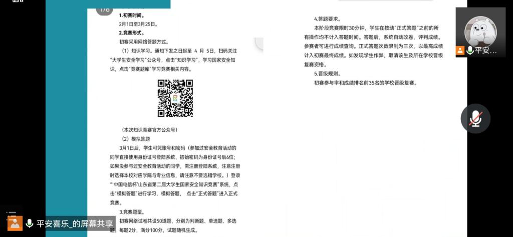 为提高同学们的国家安全知识素养,增强同学们的辨别能力,成人短视频 于3月11日以线上形式开展大学生国家安全知识竞赛学习动员会。本次活动由成人短视频 安全与权益部组织开展,会议主讲人为成人短视频 安全与权益部副部长彭楚涵。