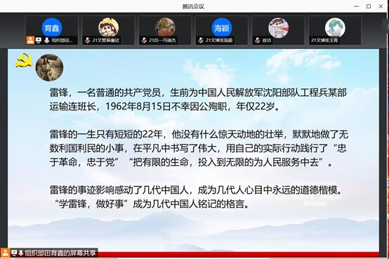 为贯彻落实习近平新时代中国特色社会主义思想,积极培养和践行社会主义核心价值观,传承中华民族传统美德,进一步弘扬雷锋精神,3月13日晚上,成人短视频 组织部通过腾讯会议举行线上学习雷锋精神主题会议。