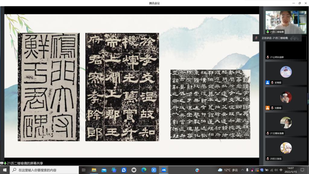 本次比赛采取线上会议形式,参赛者按次序演讲,彭佳骏、楼瑜倩、胡婧怡、王怡静、郝韵萁、孟毓莹等19位同学对禹王碑、鲜于璜碑、雁塔圣教序、晋祠铭、石鼓文、上官婉儿墓志铭等代表性碑刻或文帖作品进行介绍演讲,参赛者的演讲内容切合题目,PPT制作精美,演讲效果饱满。比赛最终由评委团评分并选出一、二、三等奖若干项。
