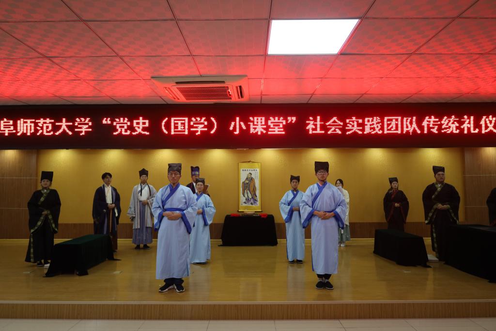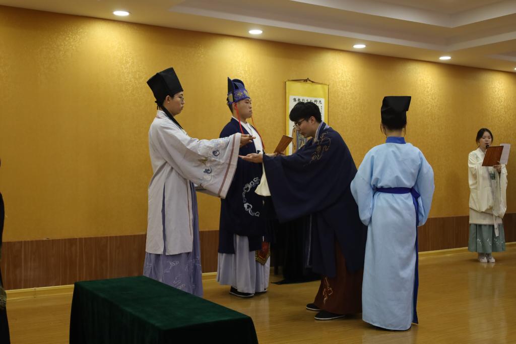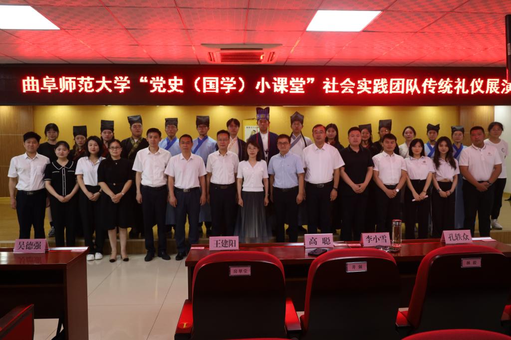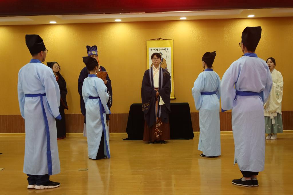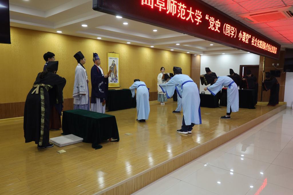 展演时,实践队员们伴随着宣赞庄严洪亮的声音,扮演师傅、宣赞、学子、侍者的队员各居其位,依次进行正衣冠、诵读《束脩告文》、献戒、执束脩、训诫、礼敬师儒等礼仪环节,一行一动,庄重整齐,引人驻足。展演结束后,队员们参观了“孔子宰中都”政德教育馆,深入了解当地文化,以便对传统文化进行进一步宣传。