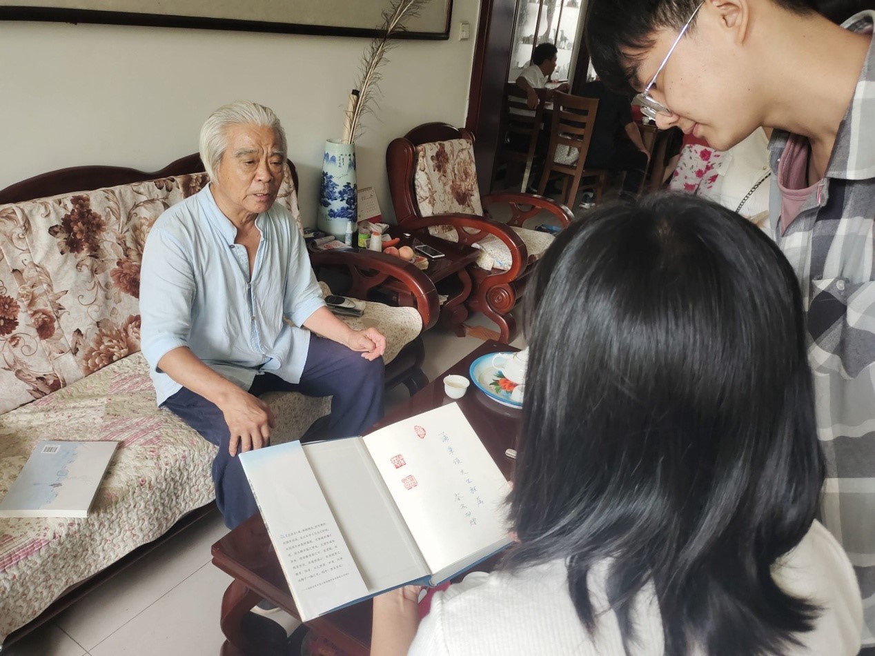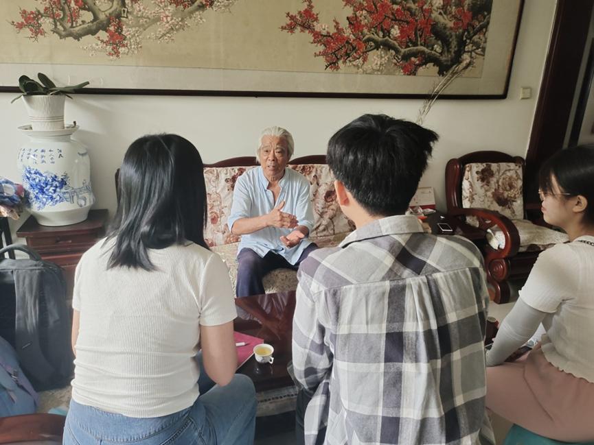 实践团队成员随后又就创新发展俚曲的表现形式与蒲老先生进行交流和探讨, 作为聊斋俚曲的国家级传承者,蒲章俊先生提到:“我们在传唱聊斋俚曲的时候,也在不断创新和发展。就《哭黄天》一曲中,我们就根据时代特色编撰新的表述内容和基调,但是在创新发展中俚曲最根本的框架不能变,最基本的曲调色彩不能变。同时戏剧团传唱时普通用淄川当地的方言来唱,更容易被观众接受,编成戏曲的形式特色也更鲜明。”