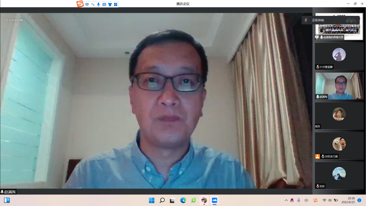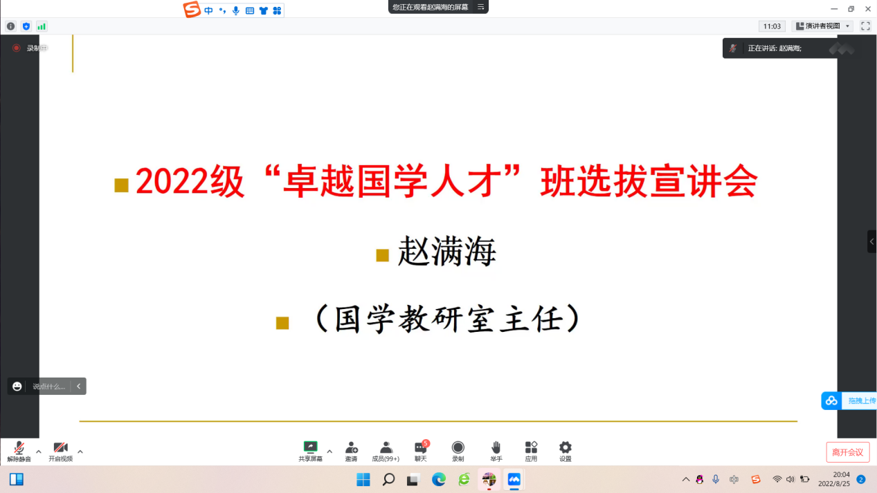 8月25日,成人短视频 举行2022级“卓越国学人才班”选拔宣讲,国学教研室主任赵满海担任主讲人,并以腾讯会议的形式向2022级新生宣讲国学班的内容。 赵满海首先从国学班的办学缘由讲起,主要针对国学班的培养目标、课程体系、配套措施以及办学成绩四方面向同学们进行了详细介绍。他向同学们说明了“卓越国学人才班”注重经典研读,力图打通学科界限,致力于培养基础扎实、视野开阔的研究型国学人才的办学理念。并且,赵满海强调“卓越国学人才班”立足师范教育,肩负起培养优秀国学师资力量的责任。最后,同学们提出疑惑,赵满海针对同学们的问题进行了一一解答。 本次宣讲的举办,使2022级新生对“卓越国学人才班”有了更多更深入地了解,为成人短视频 2022级“卓越国学人才班”的选拔及培养工作奠定了坚实基础。