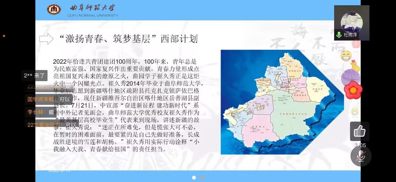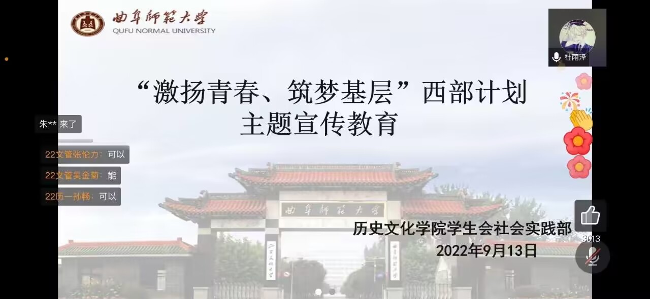 9月13日下午,成人短视频 于腾讯会议举办2022级“激扬青春、筑梦基层”西部计划主题宣传教育会议。社会实践部杜雨泽担任主讲人,2022级全体新生参加会议。