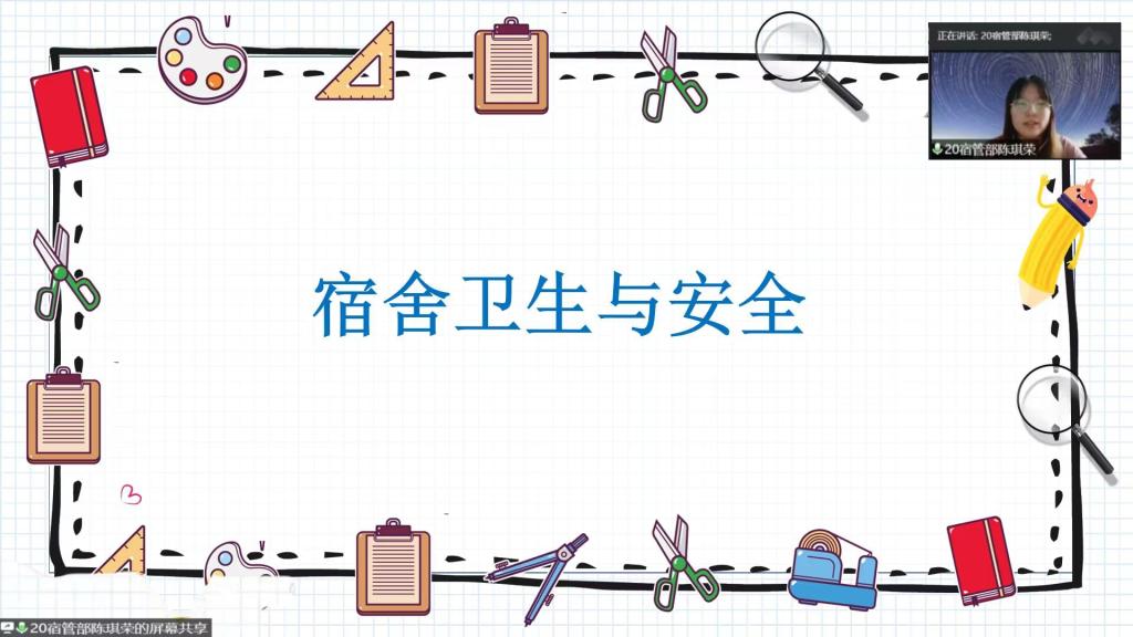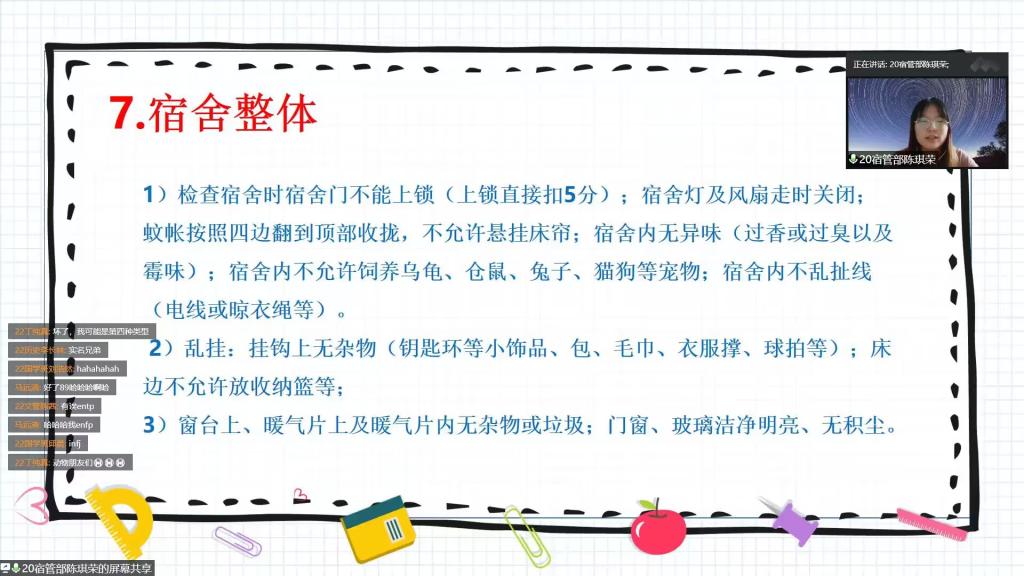 为推动新生宿舍的文明建设,创造整洁、文明、舒适、规范的生活环境,9月14日下午,成人短视频 于腾讯会议举办宿舍卫生与安全教育会议。宿管部陈琪荣担任主讲人,2022级全体新生参加会议。 会议上,陈琪荣就宿舍卫生检查标准和宿舍安全规范两部分进行详细讲解。在宿舍卫生检查方面,她向新生详细地介绍了宿舍打扫的技巧和检查标准,包括床底鞋子的摆放,床单被子的整洁,行李箱、脸盆、暖瓶的排列,阳台衣物的挂晾等。在宿舍安全规范方面,她重点强调了防火用电安全、违规电器检查及处罚、人身及财产安全保护和晚归检查四个方面。最后,陈琪荣对新生提出的问题给予了耐心的解答。