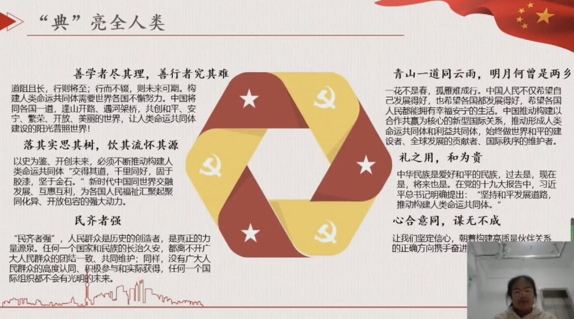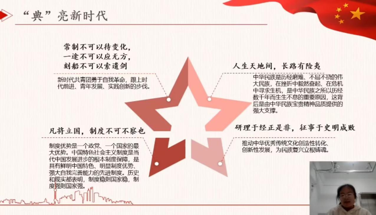 自二十大召开以来,成人短视频 就“二十大小课堂”活动面向成人短视频 学子征集作品。本次活动以线上讲课的方式进行,讲课内容围绕党的二十大精神并与中华优秀传统典籍相结合,通过对中华典籍加以解读,进而引向“党的二十大精神”。同学们通过作品积极地传达了对党的二十大见解与认知,更加深入的了解到中国优秀传统文化与党的二十大精神的内在联系。