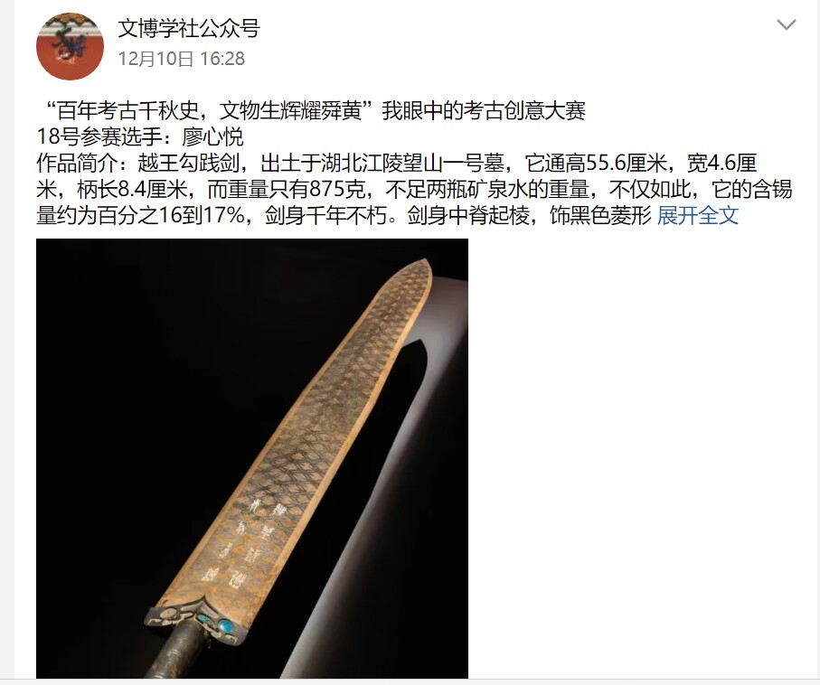 本次大赛分为征文组和图片组两个赛道,参赛选手以文字和图片为载体讲述自己对考古、文物、博物馆的了解与热衷。作品选拔阶段社团将参赛作品整理并发布至文博学社公众号,社团根据点赞量和转发量对作品进行评比。这些优秀的作品站在时间长河中与历史对话,带领我们看到一个又一个历史的细节,余味无穷。
