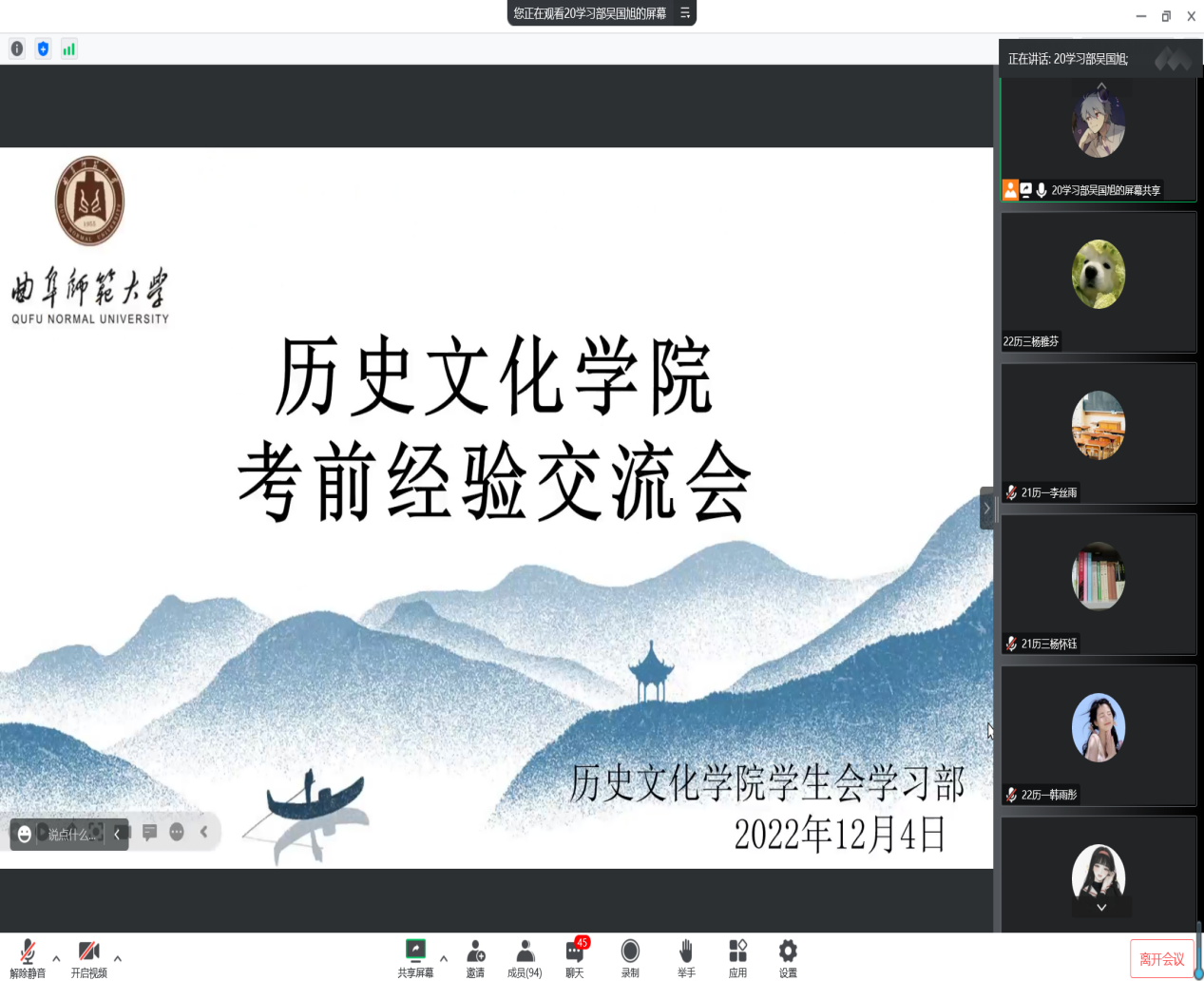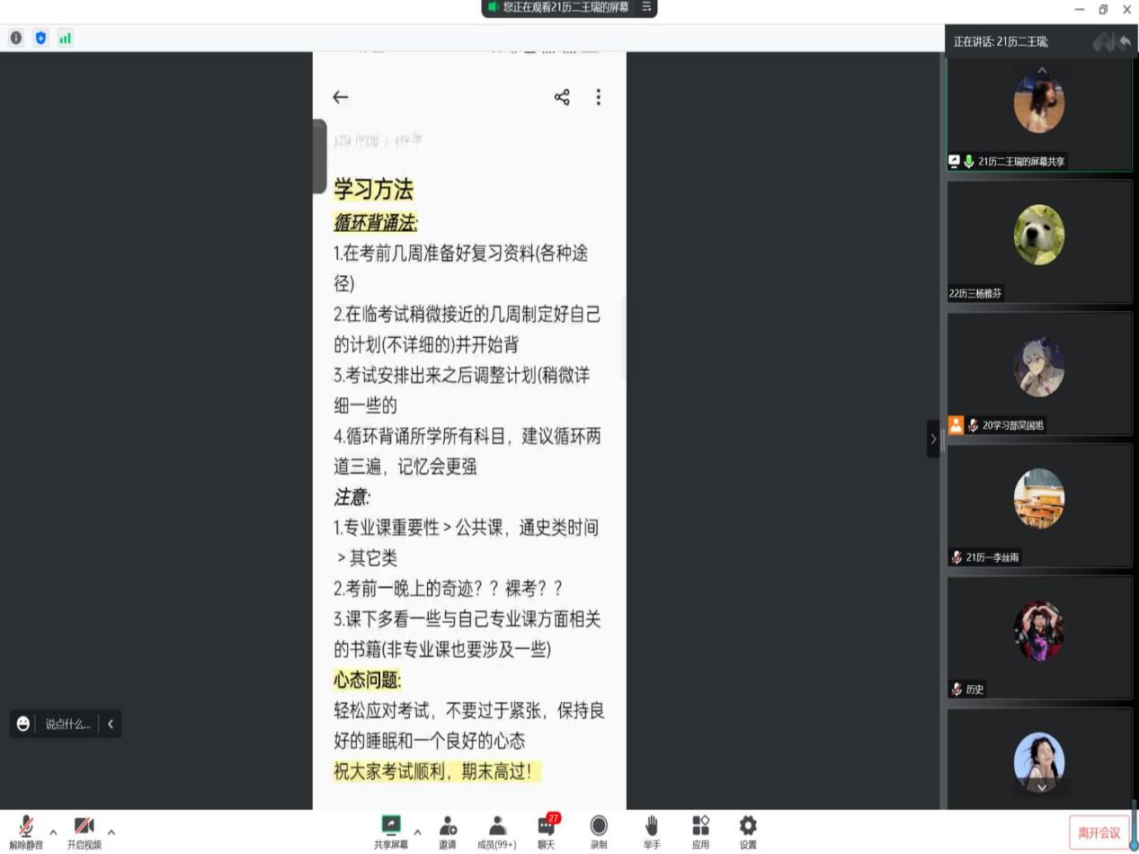 为帮助成人短视频 学子更快适应大学学习生活,加强同学们对考试问题的了解,掌握相关学习技巧,帮助同学们在考试中取得更好成绩,12月4日晚,成人短视频 于腾讯会议线上举办22级考前经验交流会。交流会邀请2021级国学、师范、文博、文管优秀学习代表参加并担任主讲人,分为四个会场,会议由学习部部长及副部主持,向2022级全体同学提供考试经验。